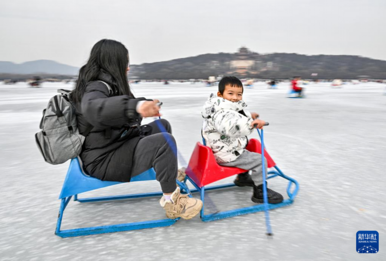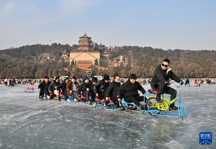 1月1日,游客在颐和园冰场玩冰车和冰上自行车。 当日是2024年元旦假期的最后一天,北京颐和园冰场迎来大量游客。今年颐和园冰场营业面积达到35万平方米,最多可容纳5000人同时在冰面嬉戏。 新华社记者 陈晔华 摄