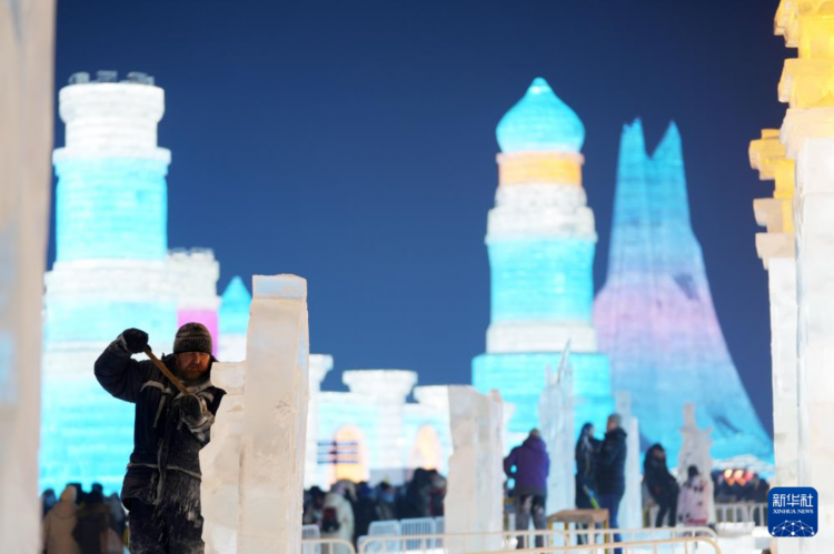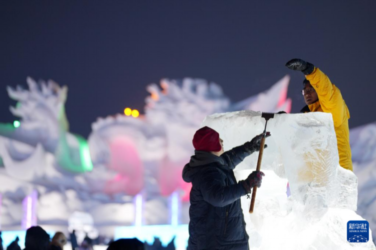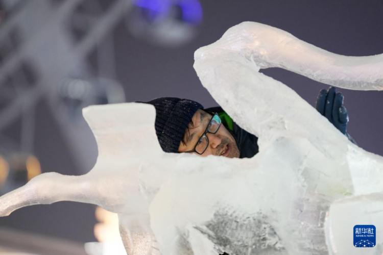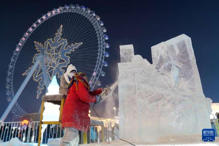 1月2日,在哈尔滨冰雪大世界园区内,参赛选手在进行冰雕创作。 当日,为期3天的第35届中国·哈尔滨国际冰雕比赛在哈尔滨冰雪大世界园区开赛。来自世界各地的30余支参赛队伍同场竞技,切磋冰雕技艺。 新华社记者 谢剑飞 摄