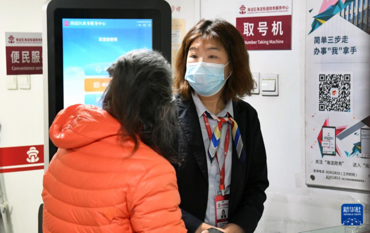 1月2日,北京市海淀区海淀街道政务服务中心的工作人员(右)为市民解答问题。 新年伊始,各行各业的劳动者忙碌在各自的岗位上,接续奋斗,干劲十足。 新华社记者 任超 摄