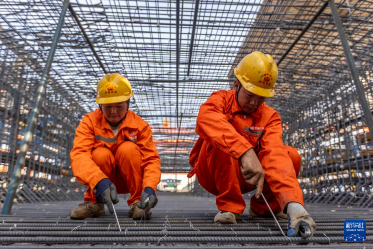 1月2日,在位于上海市浦东新区祝桥镇的沪苏通铁路二期中铁四局站前Ⅶ标项目施工现场,工作人员进行箱梁钢筋绑扎作业。 新年伊始,各行各业的劳动者忙碌在各自的岗位上,接续奋斗,干劲十足。 新华社记者 王翔 摄