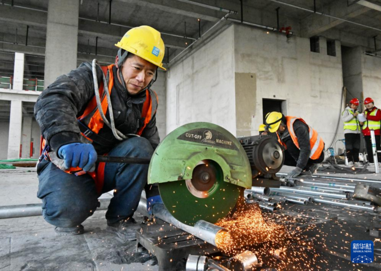 1月1日,在中建二局青岛滨海国际中心项目建设现场,来自山东海阳的刘少雷在切割加工消防喷淋管道。 新年伊始,各行各业的劳动者忙碌在各自的岗位上,接续奋斗,干劲十足。 新华社记者 李紫恒 摄