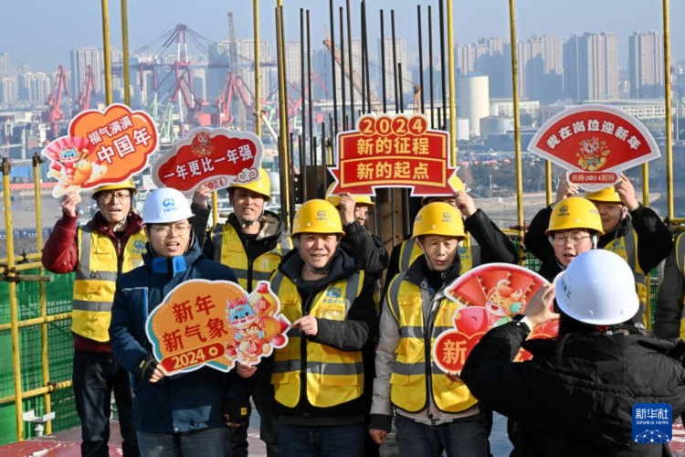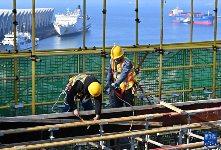 1月1日,中铁建工的建设者在山东青岛国际邮轮港区航运中心项目工地工作。 新年伊始,各行各业的劳动者忙碌在各自的岗位上,接续奋斗,干劲十足。 新华社记者 李紫恒 摄