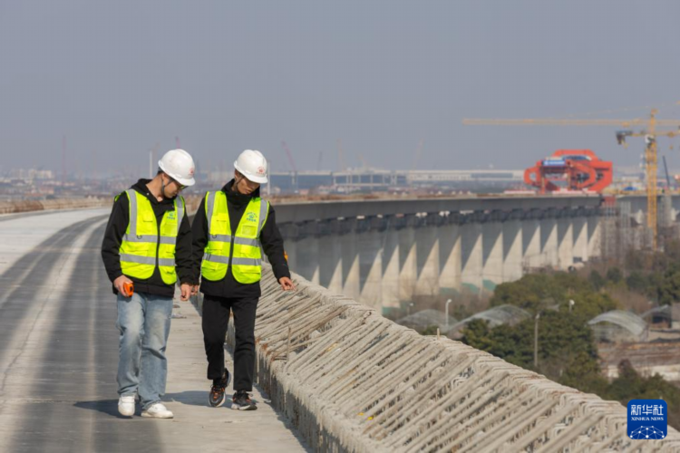 1月2日,在位于上海市浦东新区祝桥镇的沪苏通铁路二期中铁四局站前Ⅶ标项目施工现场,工作人员在巡查桥面。 新年伊始,各行各业的劳动者忙碌在各自的岗位上,接续奋斗,干劲十足。 新华社记者 王翔 摄