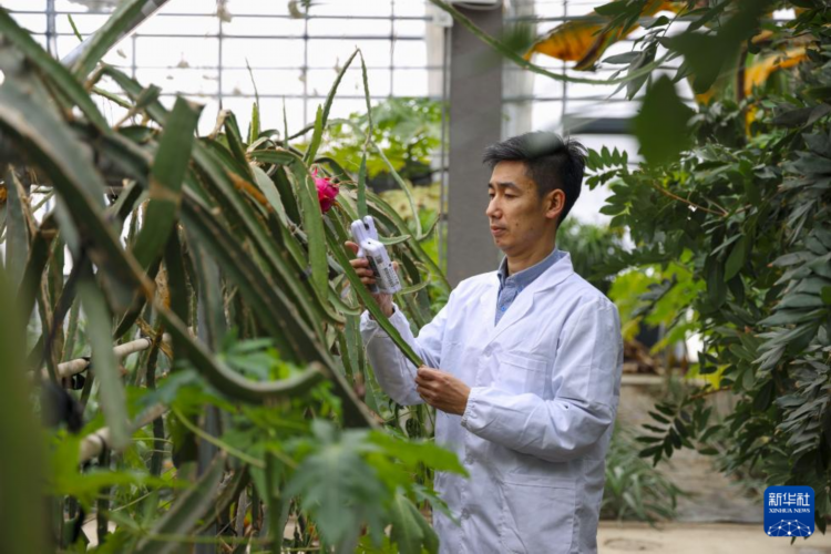 1月2日,沈阳工学院生命工程学院教师在现代农业科技馆内检测火龙果叶片成分。 新年伊始,各行各业的劳动者忙碌在各自的岗位上,接续奋斗,干劲十足。 新华社记者 杨青 摄