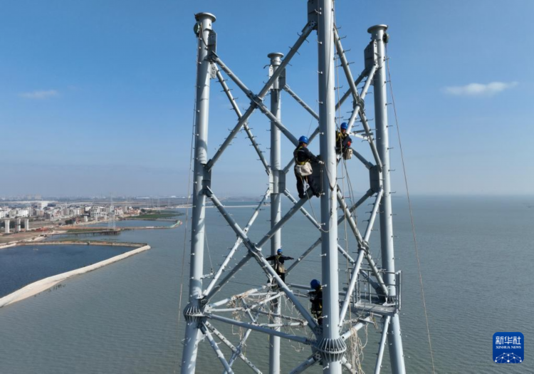 1月2日,电力施工人员在福建福清兴化湾海上架空线路工程组塔作业现场施工(无人机照片)。 新年伊始,各行各业的劳动者忙碌在各自的岗位上,接续奋斗,干劲十足。 新华社记者 林善传 摄