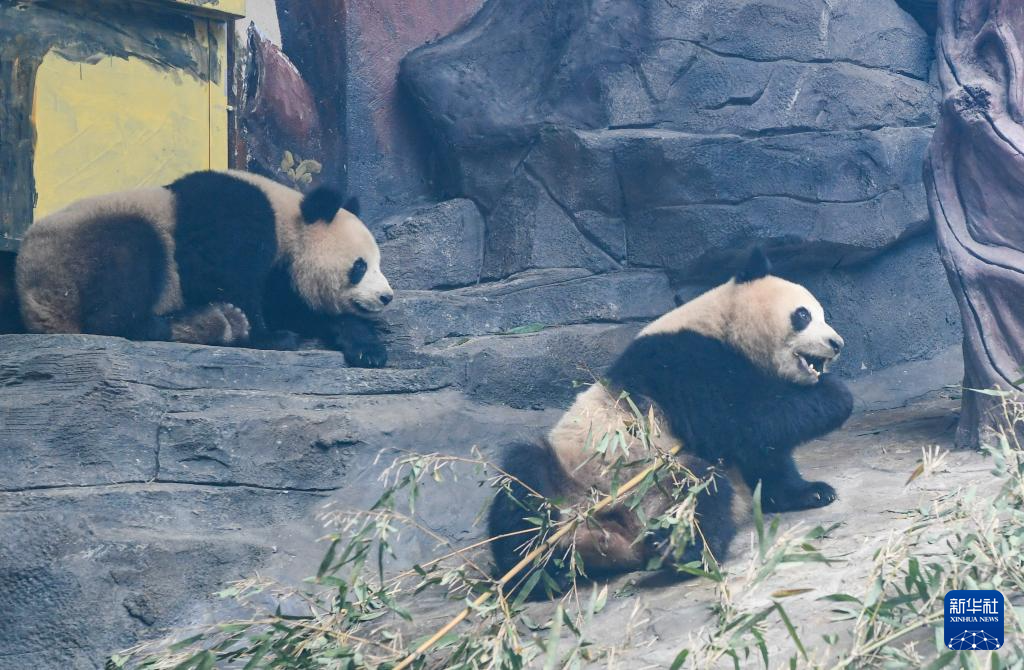 这是1月3日在重庆永川乐和乐都动物主题乐园熊猫馆拍摄的双胞胎大熊猫“青露”(左)和“青花”。 近日,来自中国大熊猫保护研究中心的四只大熊猫——“青花”“青露”“巧月”“爱莲”正式入住重庆永川乐和乐都动物主题乐园熊猫馆。目前,四只大熊猫情况稳定,正在适应新环境。适应期结束后将正式与游客见面。 新华社记者 王全超 摄