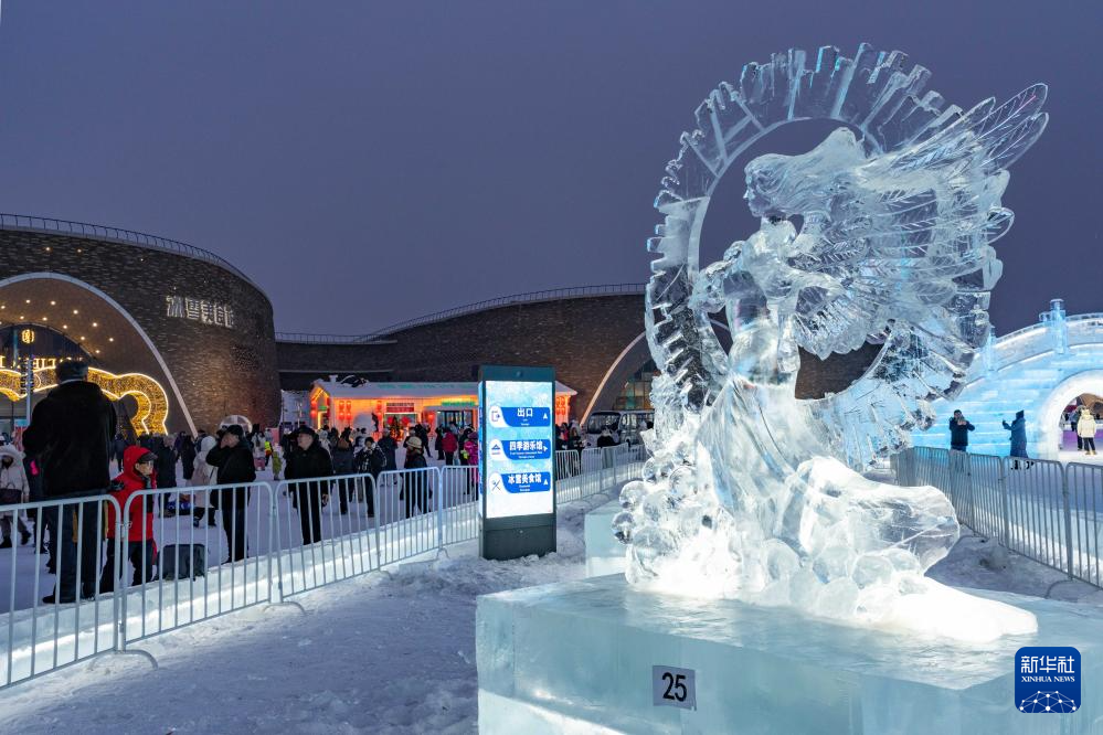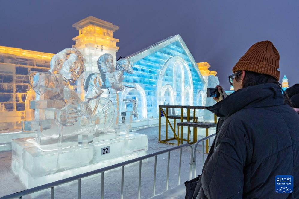 1月4日,在哈尔滨冰雪大世界园区内,游客观赏冰雕作品。 当日,为期3天的第35届中国·哈尔滨国际冰雕比赛在哈尔滨冰雪大世界园区落下帷幕。本届比赛共有来自7个国家的30余支代表队参赛,为游客献上一场冰雪视觉盛宴。 新华社记者 谢剑飞 摄