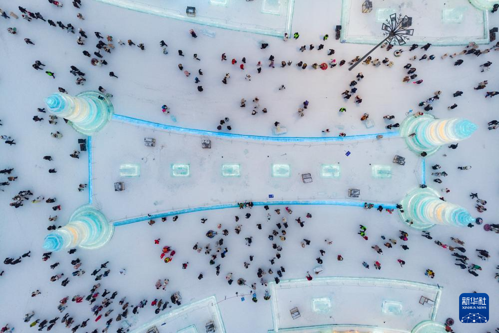 1月4日,在哈尔滨冰雪大世界园区内,游客观赏冰雕作品(无人机照片)。 当日,为期3天的第35届中国·哈尔滨国际冰雕比赛在哈尔滨冰雪大世界园区落下帷幕。本届比赛共有来自7个国家的30余支代表队参赛,为游客献上一场冰雪视觉盛宴。 新华社记者 谢剑飞 摄