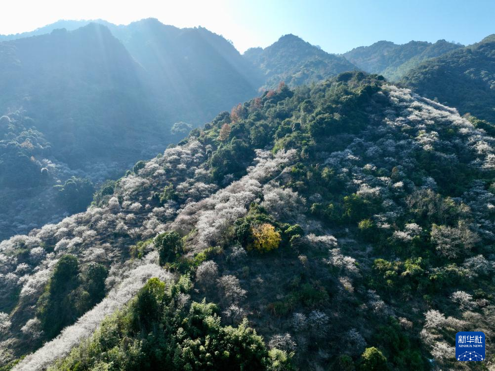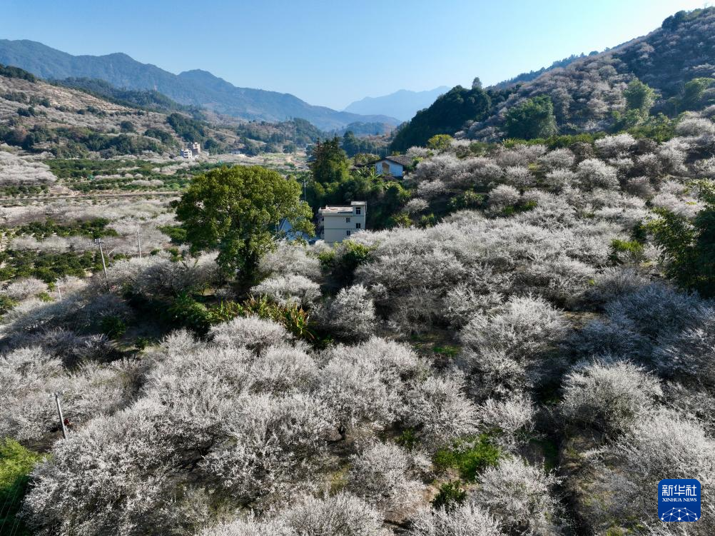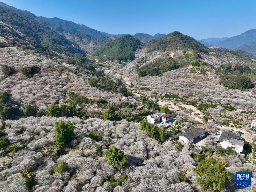 1月4日,福州市永泰县葛岭镇蒲边村山岭间青梅花盛开(无人机照片)。 新年伊始,福建省福州市永泰县山岭间山花烂漫,数万亩青梅正当花期,吸引不少游客前来赏“梅景”、品“梅韵”、寻“梅趣”。永泰县是福建省青梅主产区,因地制宜种植的5万亩青梅逐渐成为乡村振兴的特色产业。 新华社记者 姜克红 摄