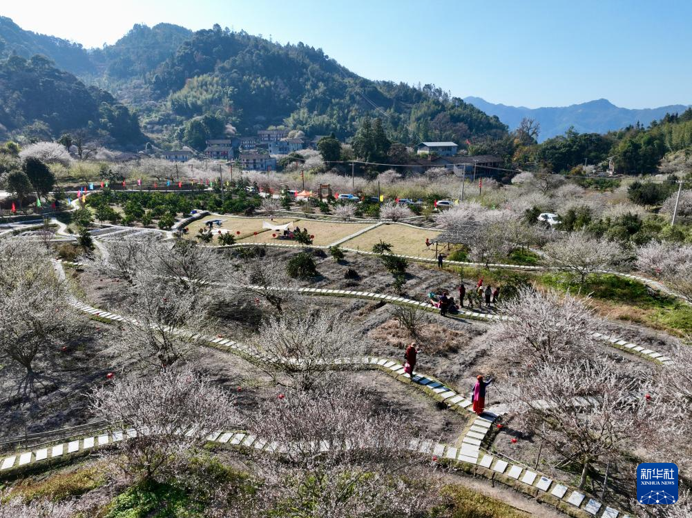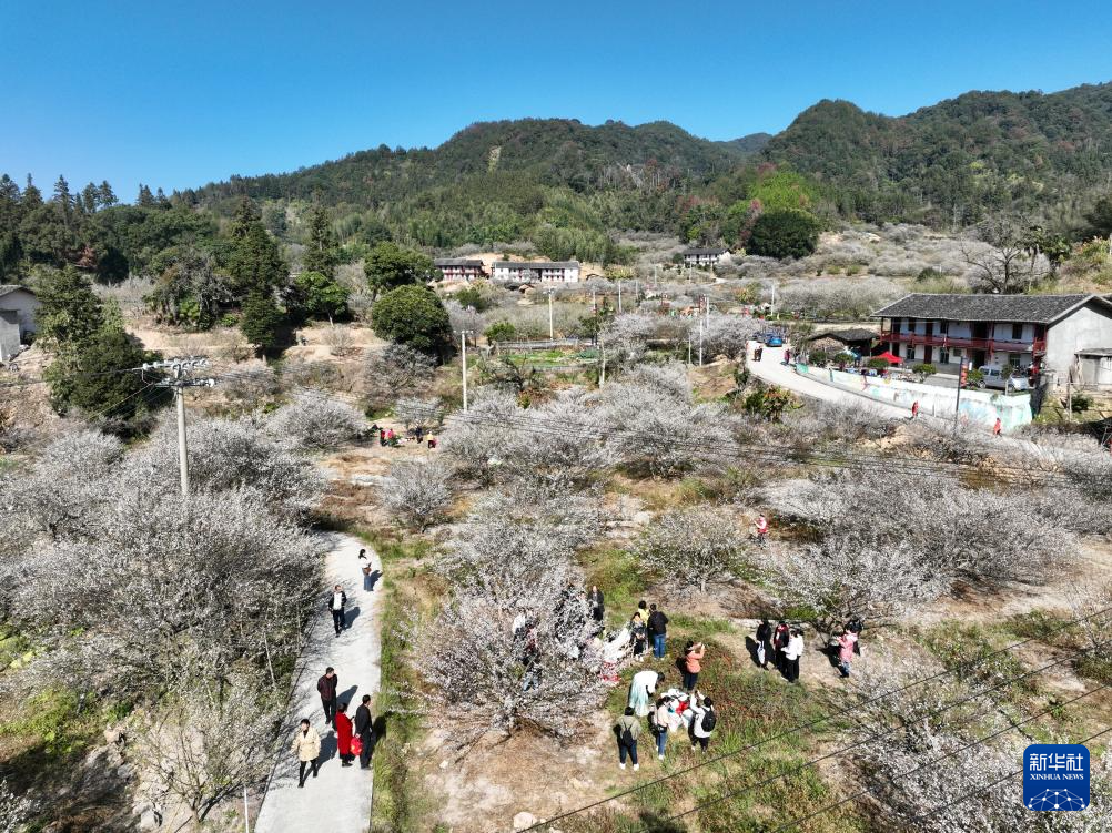 1月4日,游客在福州市永泰县葛岭镇小洲村赏花(无人机照片)。 新年伊始,福建省福州市永泰县山岭间山花烂漫,数万亩青梅正当花期,吸引不少游客前来赏“梅景”、品“梅韵”、寻“梅趣”。永泰县是福建省青梅主产区,因地制宜种植的5万亩青梅逐渐成为乡村振兴的特色产业。 新华社记者 姜克红 摄