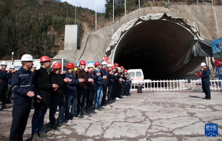 1月7日,建设者在乐民隧道出口处庆祝贯通。 当日,全长1394米的贵州盘兴铁路乐民隧道顺利贯通。据了解,盘兴铁路北起沪昆高铁盘州站,止于兴义南站,线路全长约98公里,设计时速250公里,是贵州省实现“市市通高铁”的最后一个项目。 新华社记者 刘续 摄