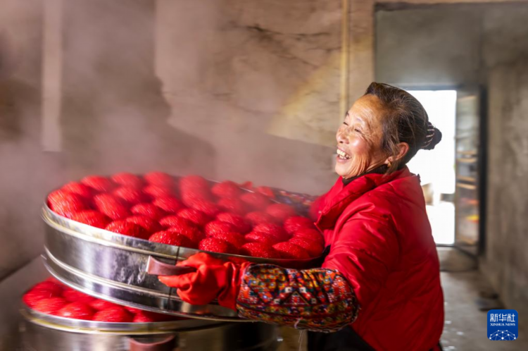 1月7日,贵州省玉屏侗族自治县田坪镇白果村村民在蒸制红粑。 在贵州省玉屏侗族自治县,许多侗族群众从农历冬月末、腊月初开始陆续制作红粑,迎接新年的到来。红粑以糯米等为原料,经过碎米、打芡、滚红上色、揉捻、蒸制等工序制作而成,象征团圆、美满,是侗族群众的传统年味美食。 新华社记者 杨楹 摄