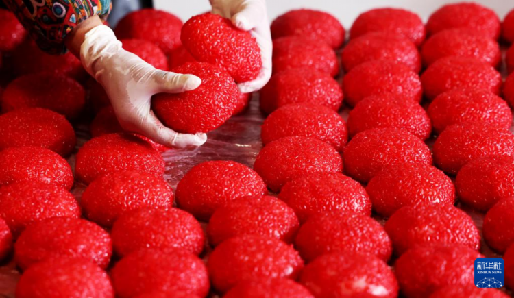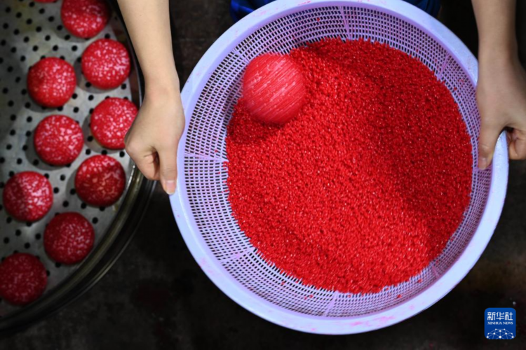 1月7日,贵州省玉屏侗族自治县田坪镇白果村村民在给红粑上色。 在贵州省玉屏侗族自治县,许多侗族群众从农历冬月末、腊月初开始陆续制作红粑,迎接新年的到来。红粑以糯米等为原料,经过碎米、打芡、滚红上色、揉捻、蒸制等工序制作而成,象征团圆、美满,是侗族群众的传统年味美食。 新华社记者 杨楹 摄