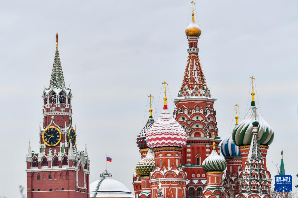 这是1月6日在俄罗斯首都莫斯科拍摄的雪后克里姆林宫(左)和圣瓦西里教堂。 近日,俄罗斯首都莫斯科迎来降温降雪。 新华社记者 曹阳 摄