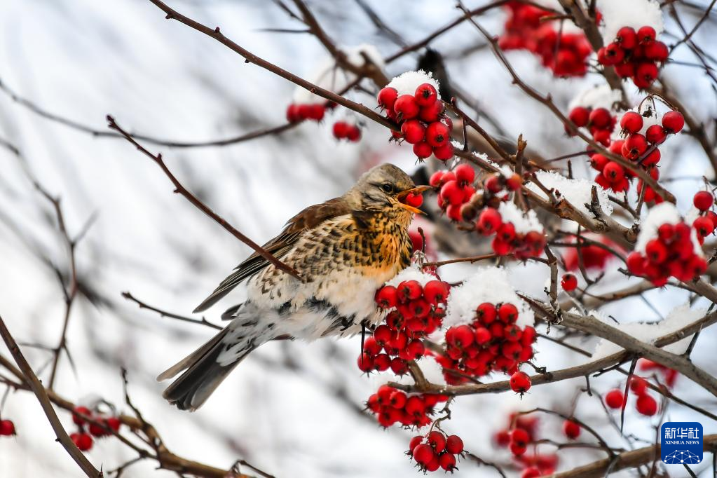 1月6日,在俄罗斯首都莫斯科,雪后树枝上的小鸟衔着果子。 近日,俄罗斯首都莫斯科迎来降温降雪。 新华社记者 曹阳 摄 |