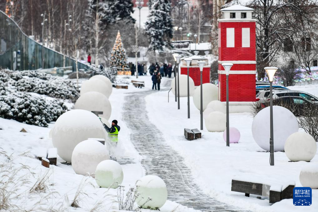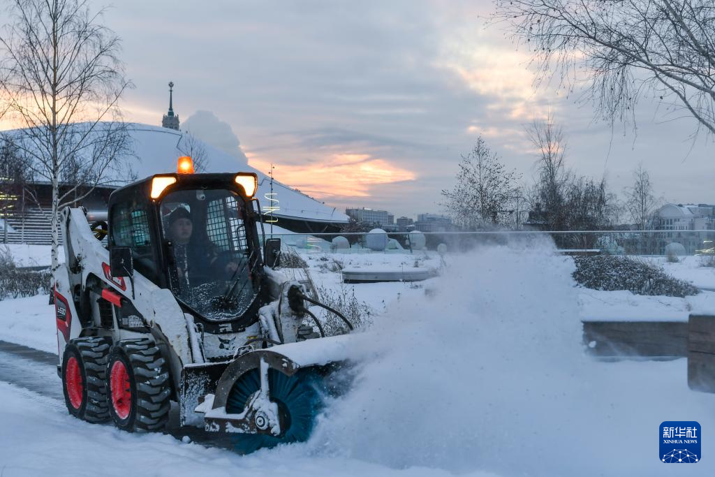 1月6日,工作人员在俄罗斯首都莫斯科街头扫雪。 近日,俄罗斯首都莫斯科迎来降温降雪。 新华社记者 曹阳 摄
