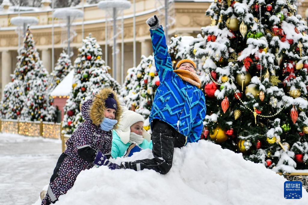 1月6日,小朋友们在俄罗斯首都莫斯科的一处雪堆上玩耍。 近日,俄罗斯首都莫斯科迎来降温降雪。 新华社记者 曹阳 摄