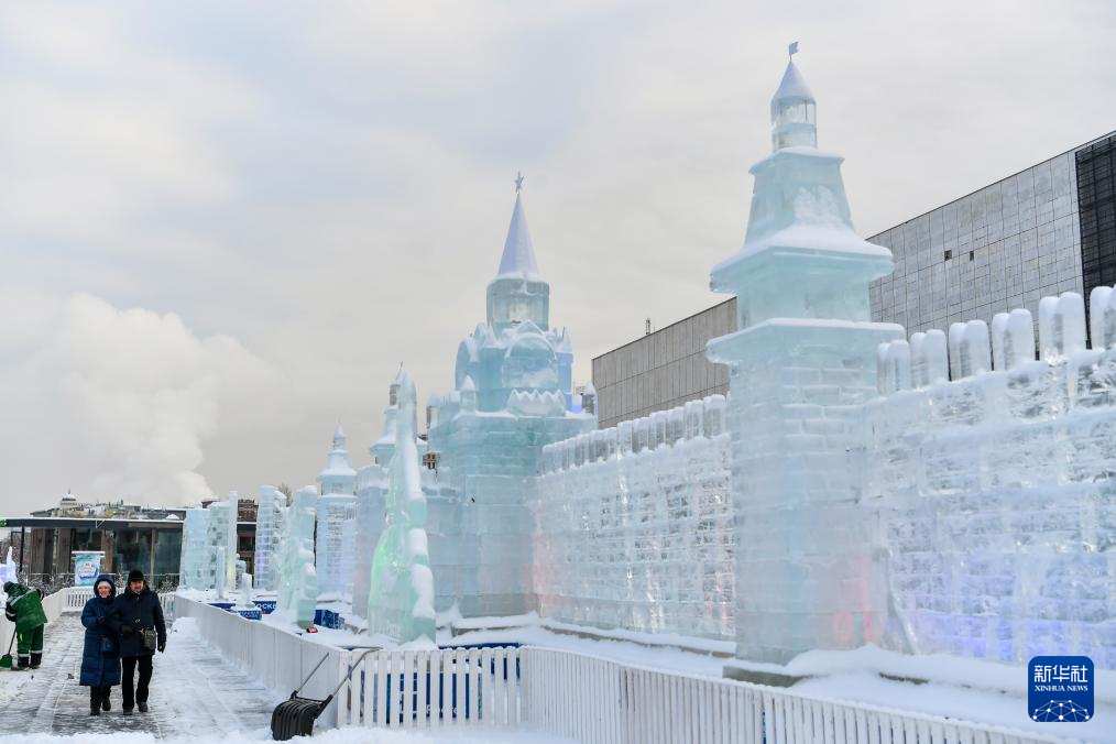 1月6日,人们路过俄罗斯首都莫斯科的一处冰雕。 近日,俄罗斯首都莫斯科迎来降温降雪。 新华社记者 曹阳 摄