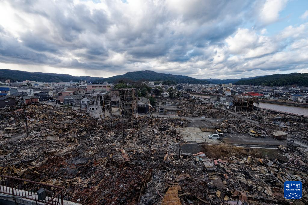 日本石川县轮岛市“轮岛早市”被地震引发的大火烧成废墟(1月4日摄)。 据日本石川县1月6日公布的最新统计数据,截至当地时间17时,能登半岛地震在该县造成的死亡人数已达126人,另有210人下落不明。 新华社记者 张笑宇 摄