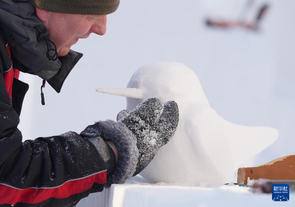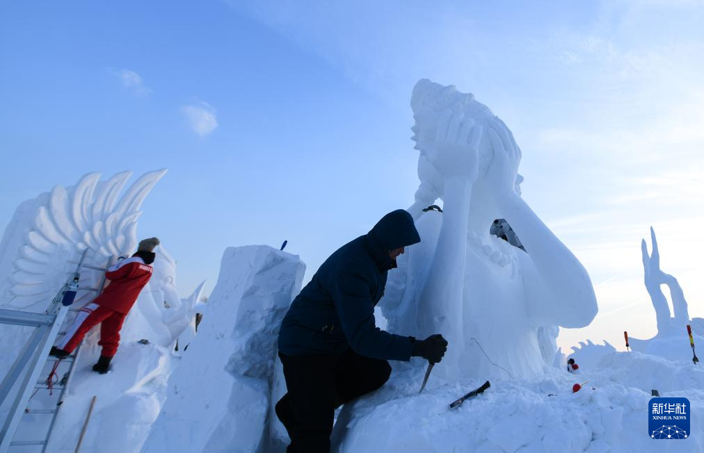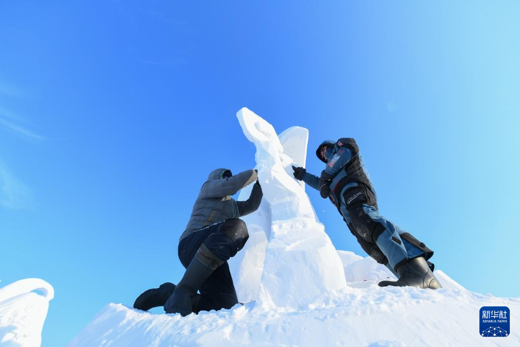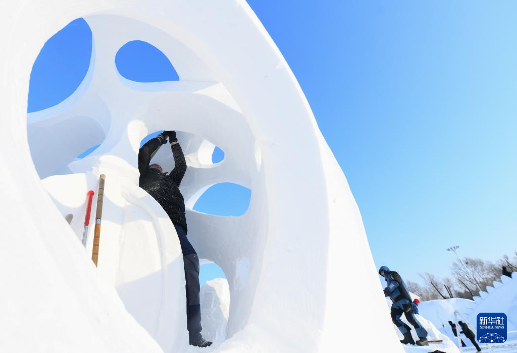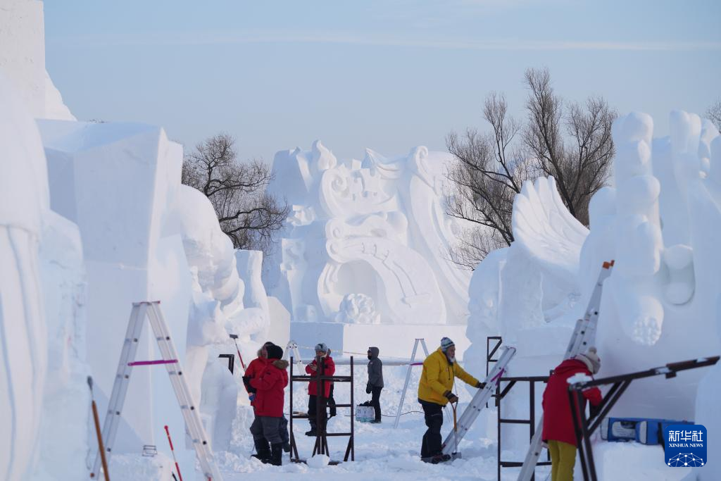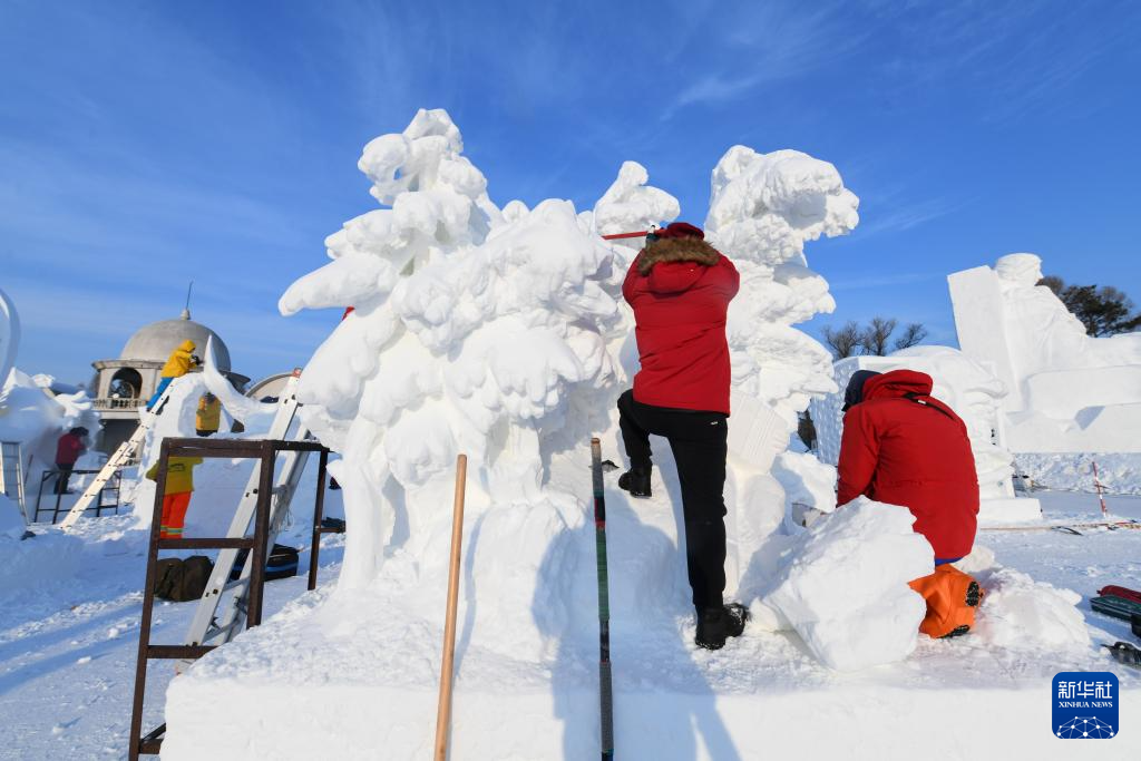 1月8日,参赛选手在进行雪雕创作。 当日,在哈尔滨太阳岛雪博会园区内举行的第26届中国·哈尔滨国际雪雕比赛进入第三天的赛程。 新华社记者 王松 摄