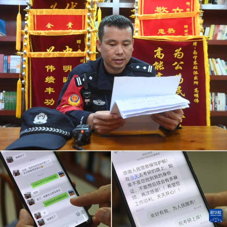这是一张拼版照片,上图是1月8日,高明伟在南宁东站派出所阅读旅客发来的感谢信;下图是旅客发来的感谢信息。 20年警察生涯,6000多件遗失物品送归失主,280多面锦旗……高明伟在平凡的警察岗位默默做着不平凡的贡献。 高明伟是南宁铁路公安局南宁公安处南宁东站派出所民警,2004年从事警察工作。在这20年警察职业生涯里,他在守护成千上万旅客南来北往旅途安全的同时,坚持做了一件“小事”——帮旅客寻找遗失物品。至今,他已为旅客找回各类遗失物品超过6000件,被旅客亲切称为“寻包达人”,获得旅客280多面感谢锦旗,并先后获得“全国公安机关爱民模范”“全国铁路公安最美基层民警”和全国铁路公安“铁警铸忠诚 岗位展风采”爱民服务模范等荣誉称号。 2019年,南宁东站设立了以高明伟名字命名的“明伟流动服务岗”,更多警察在这个爱民岗位为旅客提供更细心更热心更暖心的服务。 “在车站遇到的都是出门人,出门人都有困难的时候,就算是遗失一个钱包或者一张证件,对出门人来说有时候就是一件急事大事。”高明伟说,只要将心比心,就能想旅客之所想,急旅客之所急,解旅客之所困,热心帮助每一个有需要的出门人。 新华社记者 陆波岸 摄 |