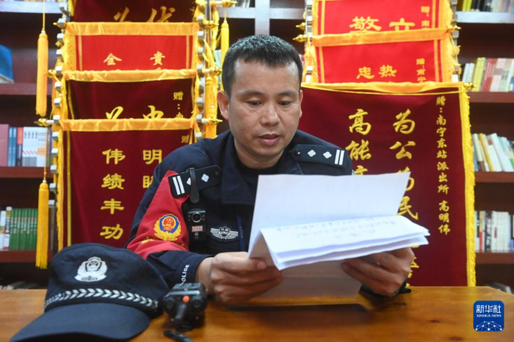 1月8日,高明伟在南宁东站派出所阅读旅客送来的感谢信。 20年警察生涯,6000多件遗失物品送归失主,280多面锦旗……高明伟在平凡的警察岗位默默做着不平凡的贡献。 高明伟是南宁铁路公安局南宁公安处南宁东站派出所民警,2004年从事警察工作。在这20年警察职业生涯里,他在守护成千上万旅客南来北往旅途安全的同时,坚持做了一件“小事”——帮旅客寻找遗失物品。至今,他已为旅客找回各类遗失物品超过6000件,被旅客亲切称为“寻包达人”,获得旅客280多面感谢锦旗,并先后获得“全国公安机关爱民模范”“全国铁路公安最美基层民警”和全国铁路公安“铁警铸忠诚 岗位展风采”爱民服务模范等荣誉称号。 2019年,南宁东站设立了以高明伟名字命名的“明伟流动服务岗”,更多警察在这个爱民岗位为旅客提供更细心更热心更暖心的服务。 “在车站遇到的都是出门人,出门人都有困难的时候,就算是遗失一个钱包或者一张证件,对出门人来说有时候就是一件急事大事。”高明伟说,只要将心比心,就能想旅客之所想,急旅客之所急,解旅客之所困,热心帮助每一个有需要的出门人。 新华社记者 陆波岸 摄