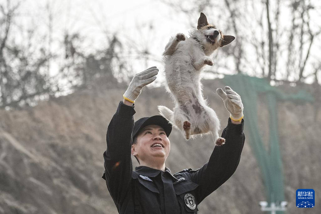 1月10日,训导员和警犬“杰克”在训练间隙玩耍。 当日,湖北省黄石市公安局刑侦支队警犬训练大队对警犬开展强化训练,为即将到来的2024春运安全保障工作做好准备。 新华社记者 伍志尊 摄 |
