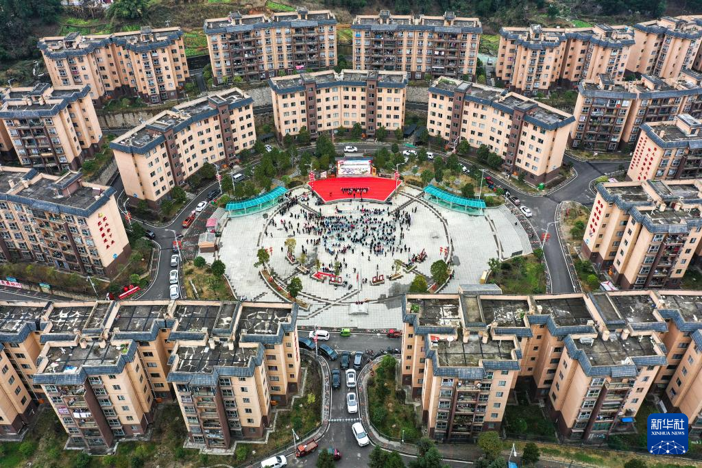 这是1月11日拍摄的贵州省龙里县冠山街道奋进社区2023年集体经济收益分红大会现场(无人机照片)。 当日,贵州省黔南布依族苗族自治州龙里县冠山街道奋进社区召开2023年集体经济收益分红大会,4460户易地扶贫搬迁群众喜获分红。 近年来,龙里县冠山街道奋进社区通过创办劳务公司和扶贫车间、盘活门面和停车场、出租蔬菜大棚等方式,多措并举促进产业发展,逐步壮大集体经济,让搬迁群众在“家门口”就业增收。 新华社记者 杨文斌 摄pagebreak