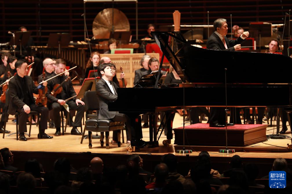 1月12日,在美国费城,中国钢琴家张昊辰(中)在2024年费城交响乐团新春音乐会上演出。 12日晚,费城交响乐团新春音乐会在美国费城金梅尔表演艺术中心举行。中国爱乐乐团和上海交响乐团总监、知名指挥家余隆携手多位中国艺术家,与费城交响乐团通力合作,带领2000余名观众在传统与现代之间穿梭,在东方与西方经典之间徜徉,跟随动人的音符共同迎接中国农历新年的到来。 新华社记者 谢锷 摄