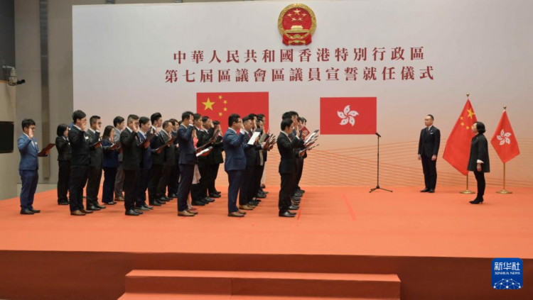 2024年1月1日,中华人民共和国香港特别行政区第七届区议会区议员宣誓就任仪式在特区政府总部会议厅举行。 新一届区议员履新即积极作为、特区政府“抢人才”“抢企业”奋发有为、粤港澳大湾区加速融合发展……新年伊始,香港万象更新,生机勃勃,特区政府和社会各界正按国家“十四五”规划和行政长官施政报告为香港擘画的蓝图加速前进。 展望2024年,随着香港基本法第二十三条立法年内完成,香港新经济动力不断显现、社会活力持续增强,香港将进一步搞活经济、改善民生,展现稳定繁荣、由治及兴的喜人景象。 新华社发(香港特区政府新闻处供图)