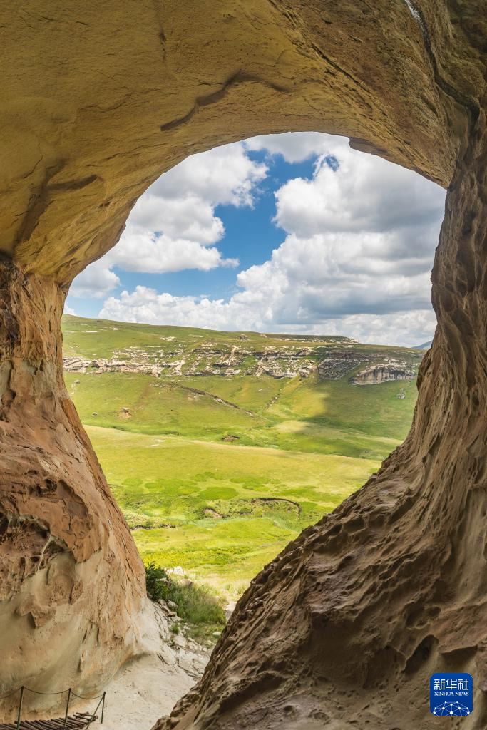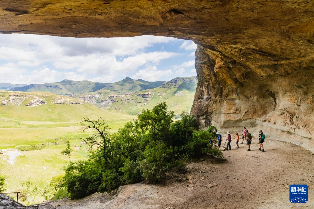 1月14日,游客在南非金门高地国家公园一处岩洞内游览。 金门高地国家公园位于南非自由邦省,距约翰内斯堡320公里,以在日光照耀下呈现金色的砂岩峭壁而闻名。 新华社记者 张誉东 摄