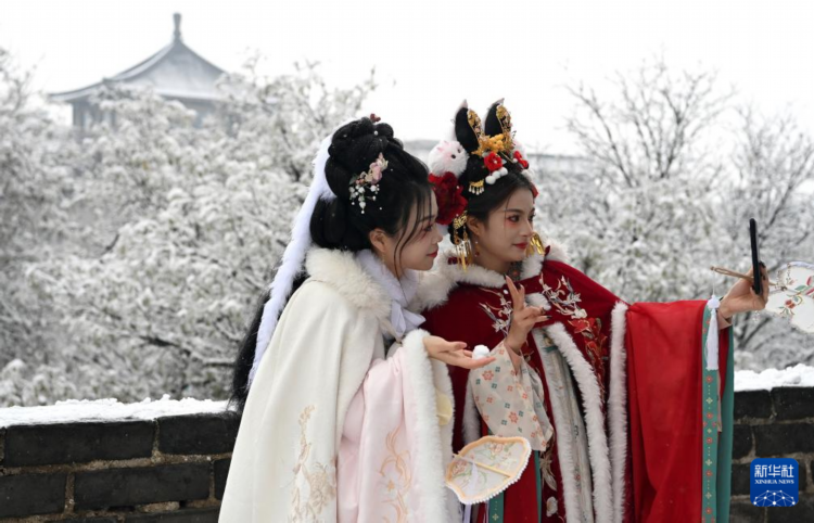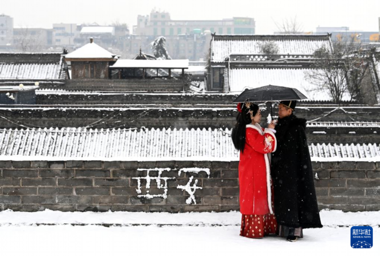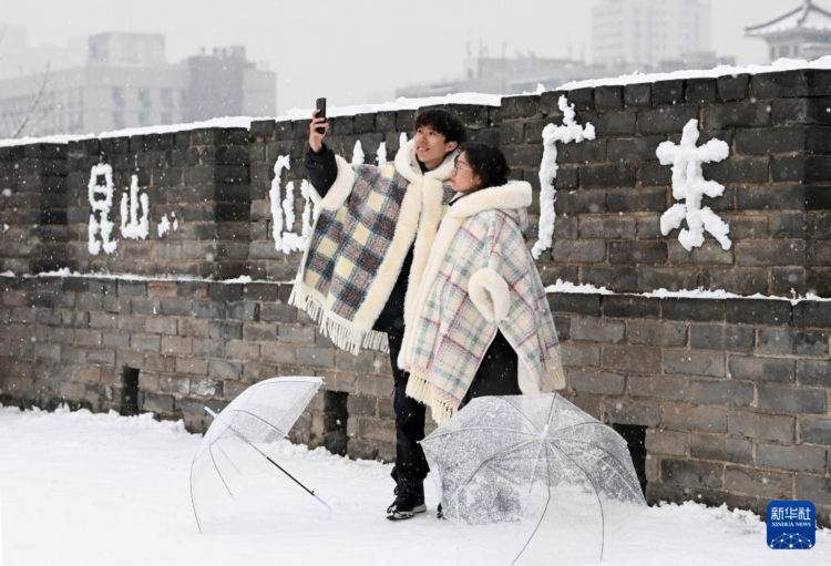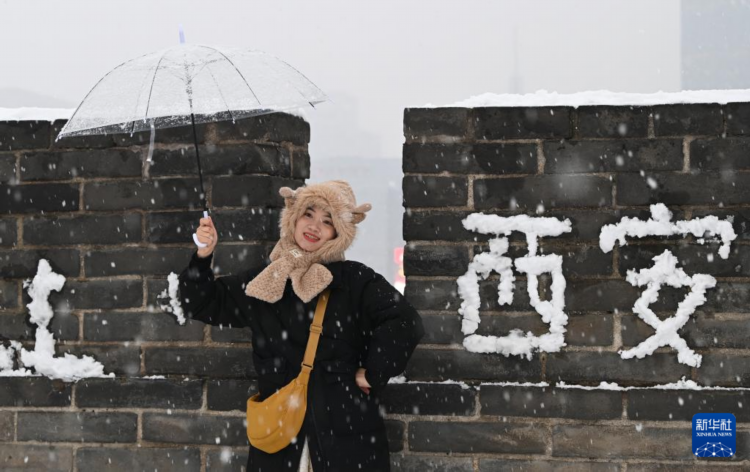 1月16日,游客在西安城墙拍照。 当日,西安迎来降雪。 新华社记者 刘潇 摄