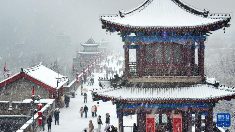 1月16日,游客在西安城墙观景赏雪。 当日,西安迎来降雪。 新华社记者 邹竞一 摄