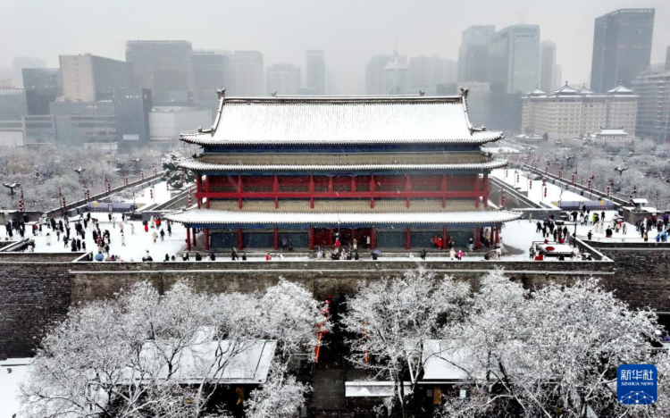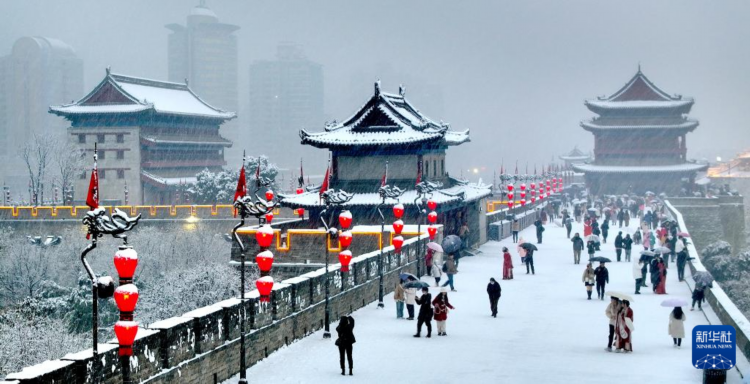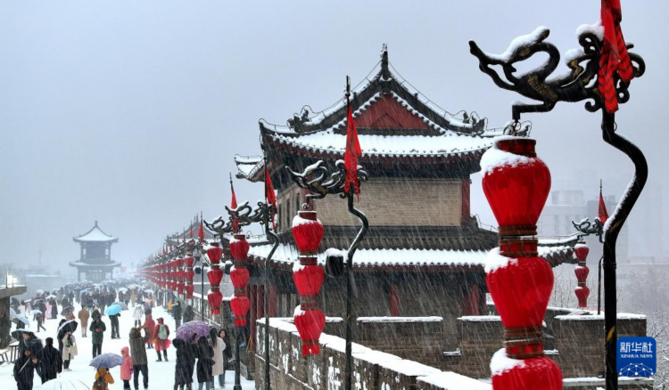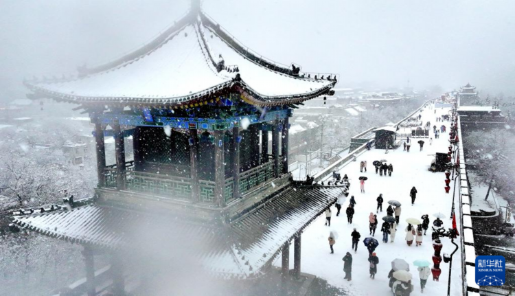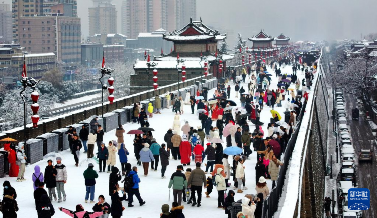 1月16日,游客在西安城墙观景赏雪。 当日,西安迎来降雪。 新华社记者 刘潇 摄