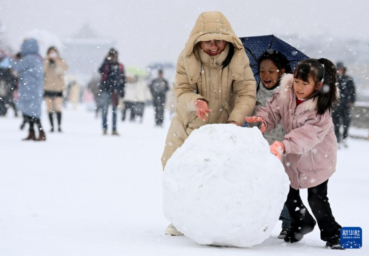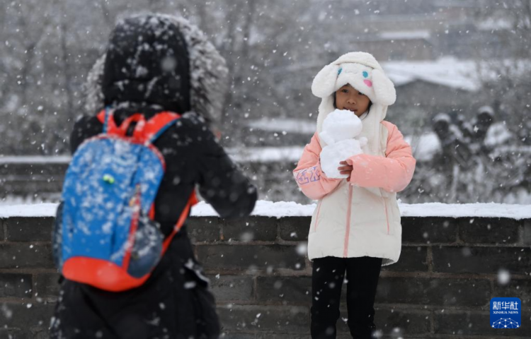 1月16日,游客在西安城墙玩雪。 当日,西安迎来降雪。 新华社记者 邹竞一 摄