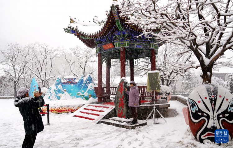 1月16日,游客在西安临潼华清宫赏雪游览。 当日,西安迎来降雪。 新华社发(王三合 摄)