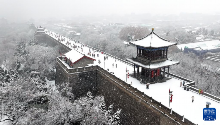 1月16日,游客在西安城墙观景赏雪(无人机照片)。 当日,西安迎来降雪。 新华社记者 刘潇 摄