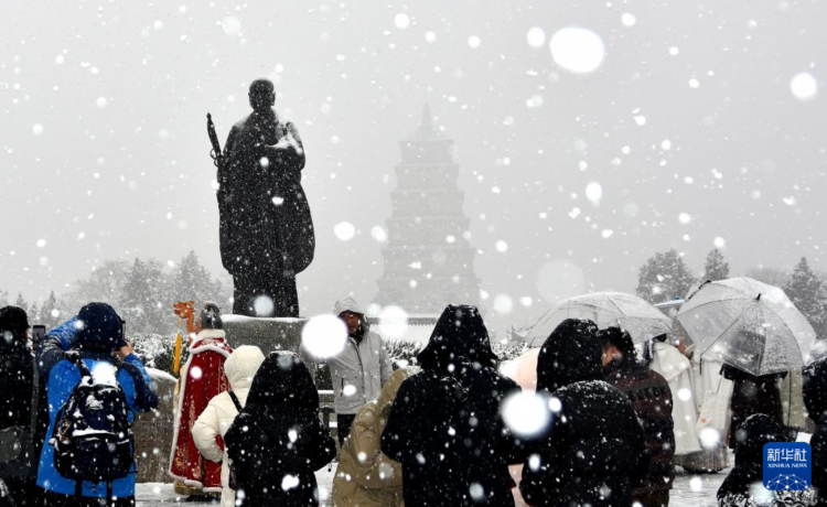 1月16日,游客在西安大雁塔观景赏雪。 当日,西安迎来降雪。 新华社记者 张京品 摄
