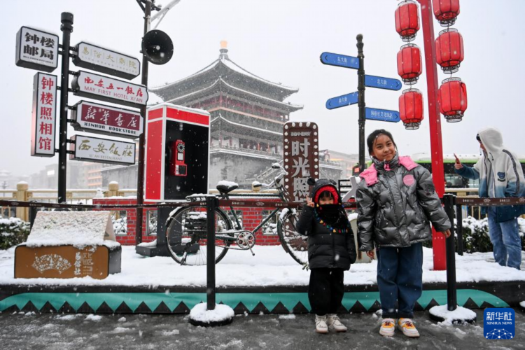 1月16日,游客在西安钟楼赏雪合影。 当日,西安迎来降雪。 新华社记者 邹竞一 摄 |