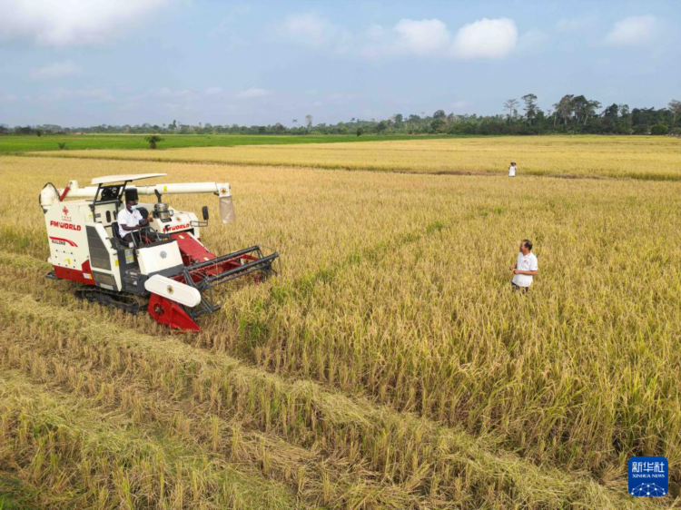1月8日,在科特迪瓦南部迪沃省格格杜垦区,中国援科农业技术合作组组长郭长友(右一)指导稻农驾驶收割机收割水稻(无人机照片)。 1997年,科特迪瓦格格杜垦区迎来了第一批中国农业技术合作组。作为中科两国建交后的首个成套农业项目,经过近30年、11期援非农业专家的不懈努力,如今的格格杜垦区不仅是中科两国农业合作示范基地,更是科特迪瓦全国闻名的水稻种植基地。 新华社记者 韩旭 摄