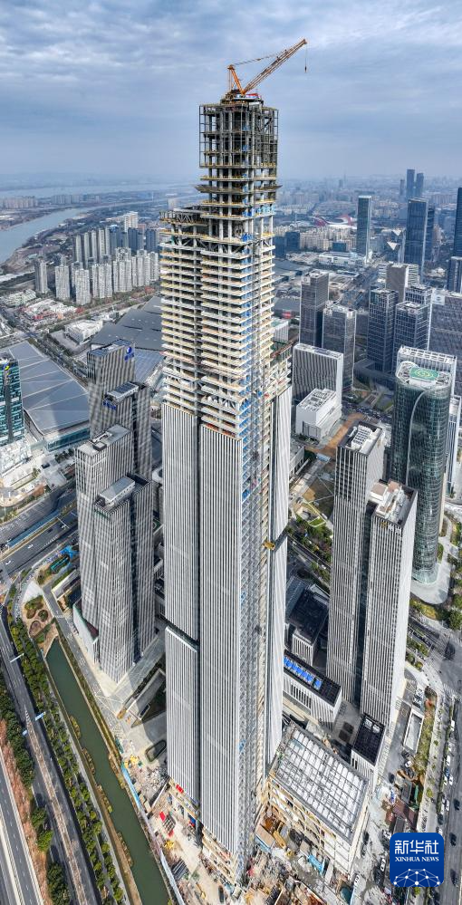 这是1月16日拍摄的南京金融城二期(东区)项目主体结构(无人机照片)。 当日,由中建四局承建的南京金融城二期(东区)项目主体结构全面封顶。据介绍,该项目位于南京市建邺区,由南京紫金投资集团建设运营,总建筑面积约42.9万平方米,包含2栋超高层及4栋配套裙楼,其中主塔楼总高度为416.6米,是集办公、酒店、公寓、商业于一体的超大型综合性建筑群。 新华社记者 李博 摄