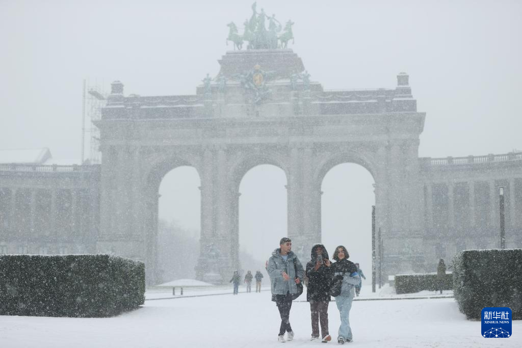 1月17日,在比利时布鲁塞尔,人们冒雪在五十年宫公园游玩。