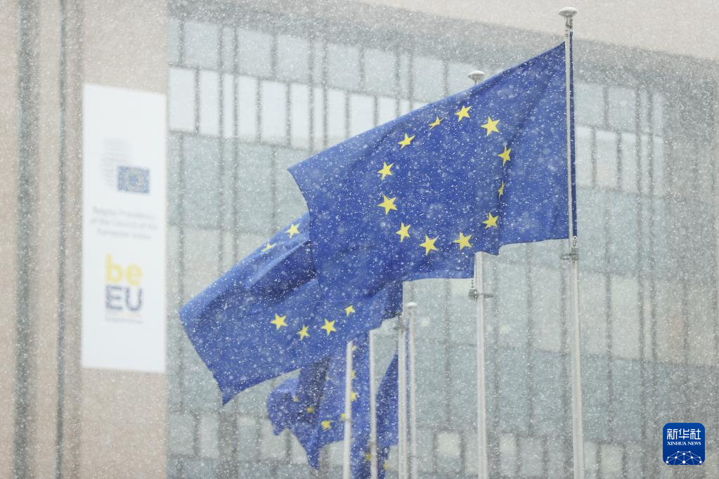 1月17日,在比利时布鲁塞尔,欧盟旗帜在雪中飘扬。