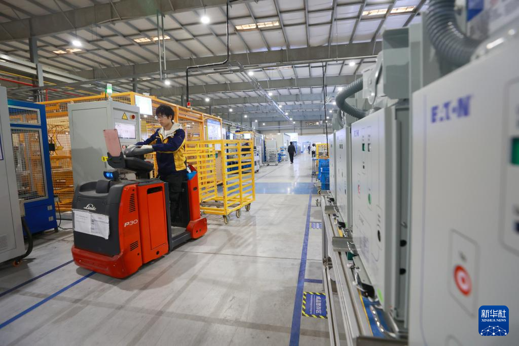 1月17日,在位于江苏省常州市天宁经济开发区的一家电力设备有限公司生产车间内,工人在转运物料。 新年伊始,位于江苏省常州市的各企业开足马力生产,赶制订单,冲刺“开门红”。 新华社记者 毛俊 摄pagebreak