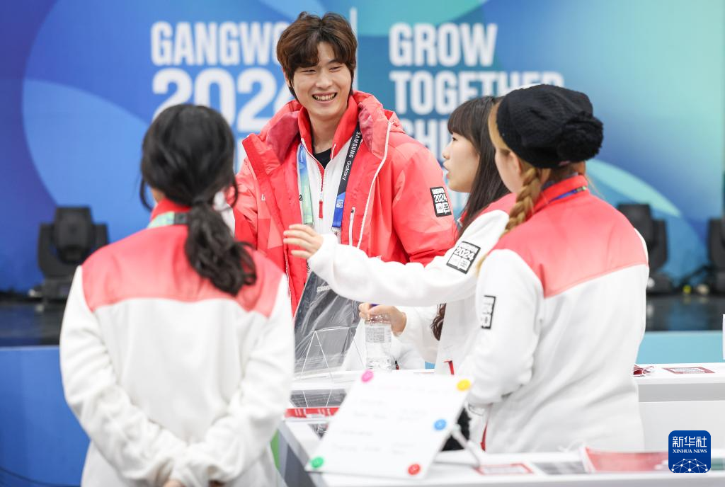 1月18日,志愿者在冬青奥村内交流。 新华社记者 胡虎虎 摄