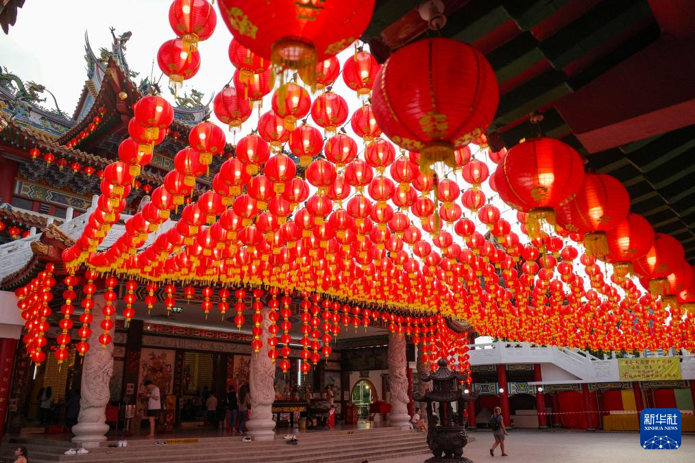 1月21日,人们在马来西亚吉隆坡天后宫参观。 近日,马来西亚吉隆坡天后宫每晚点亮几千只红灯笼,迎接农历甲辰龙年的到来。 新华社记者 程一恒 摄