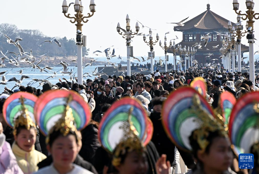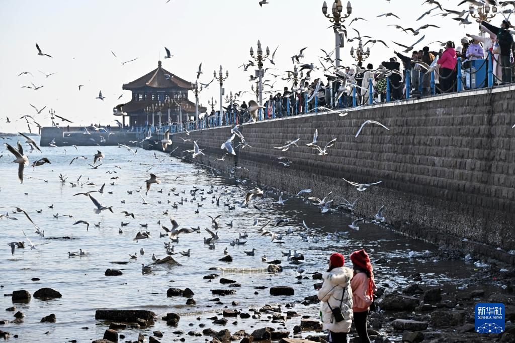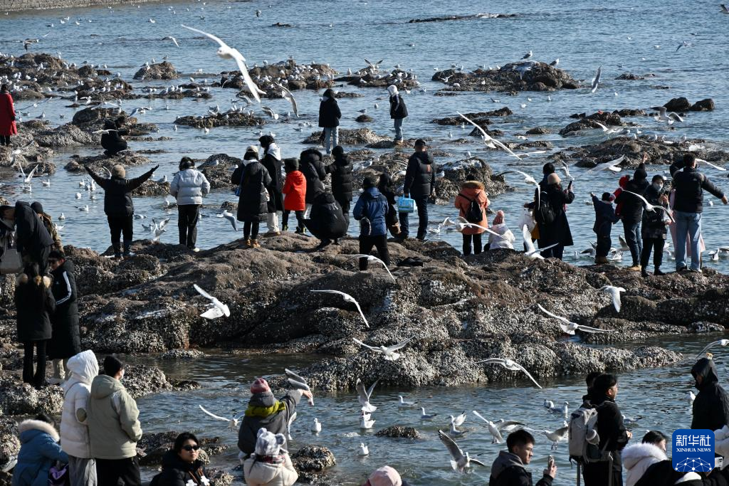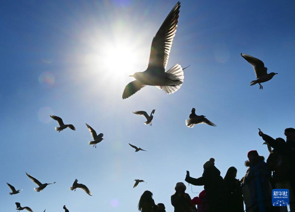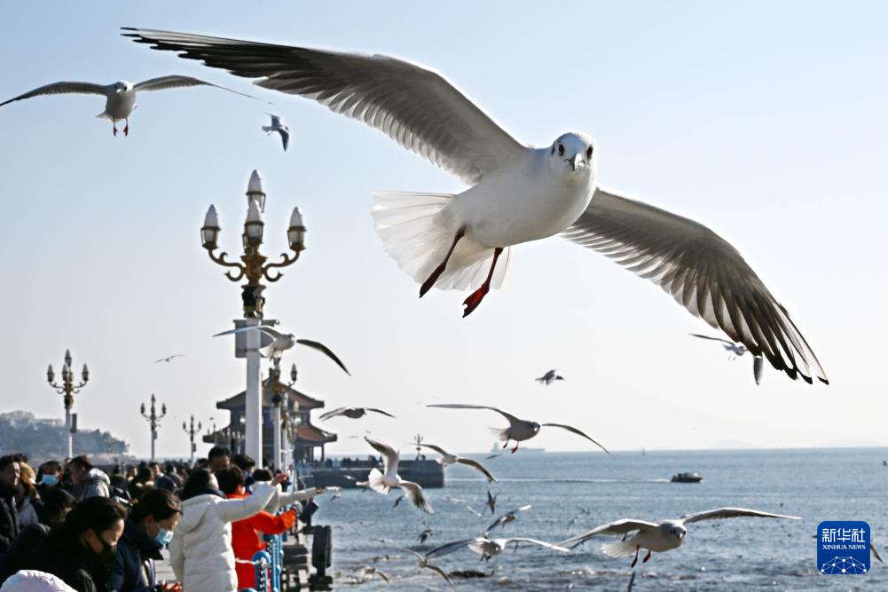 1月24日,游客在青岛市市南区栈桥景区游玩、赏鸥。 近日,青岛文旅部门发出“岛城‘鸥’遇”的邀请,吸引全国各地游客前来打卡、赏鸥。 新华社记者 李紫恒 摄pagebreak