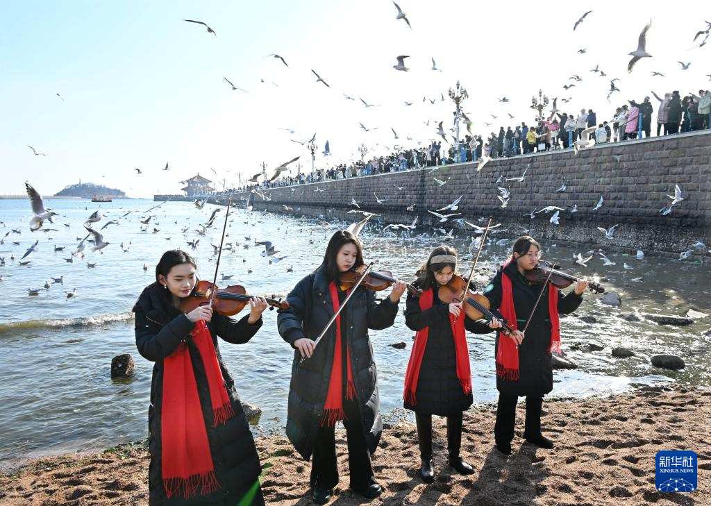 1月24日,几名小提琴乐手在青岛市市南区栈桥景区海滩上演奏。 近日,青岛文旅部门发出“岛城‘鸥’遇”的邀请,吸引全国各地游客前来打卡、赏鸥。 新华社记者 李紫恒 摄pagebreak