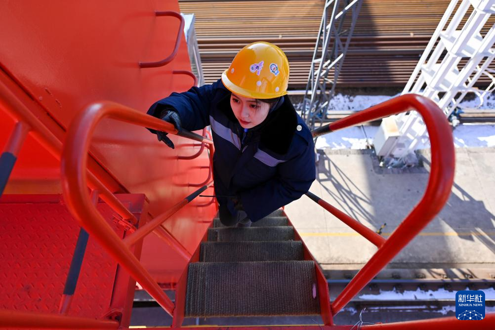 在位于山西大同的湖东钢轨焊接整修基地,代娇娇沿着龙门吊的扶梯向上攀爬(1月23日摄)。 中国铁路太原局集团有限公司太原工务机械段湖东钢轨焊接整修基地位于山西大同,“90后”女孩代娇娇是基地内女子吊装工区的一名龙门吊司机。每次作业,她都需要徒手攀爬十米多高,在仅有两平方米左右的操作室内工作,将一根根钢轨原材料精准吊运到生产线上。 春运即将来临,代娇娇和同事们的工作也变得更加忙碌。代娇娇说:“看着眼前一列列火车经过,想到自己每一次精准吊运都是为了保障列车的安全运行,心里充满了自豪感。” 新华社记者 杨晨光 摄pagebreak