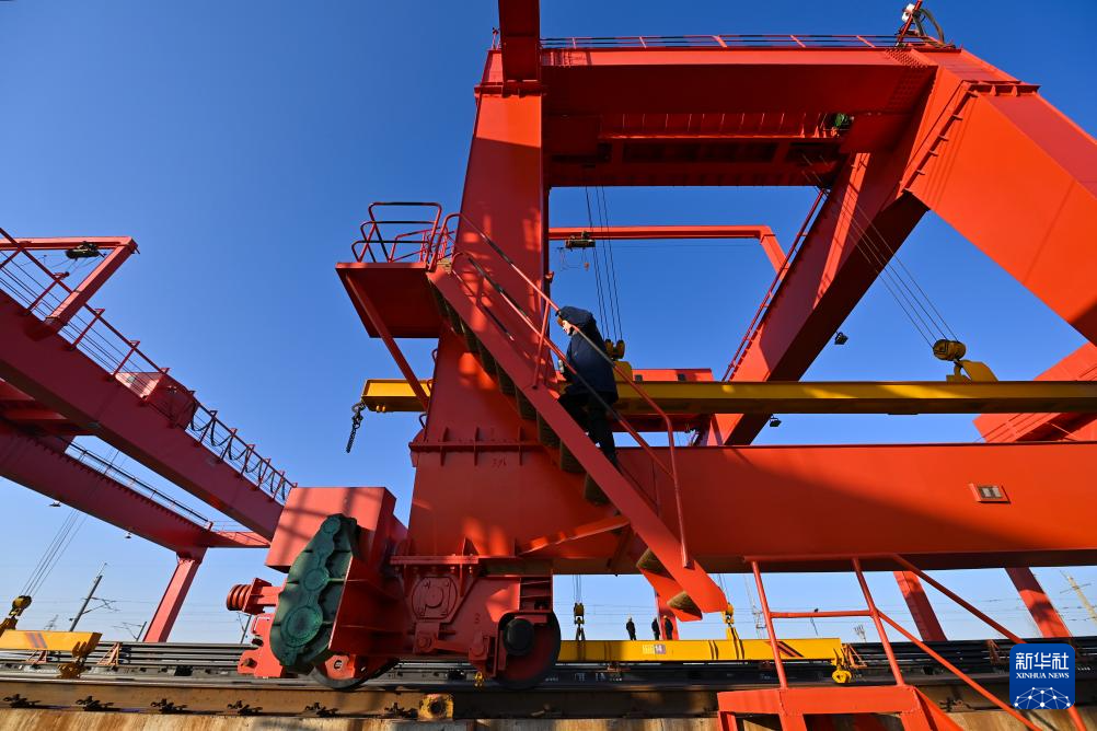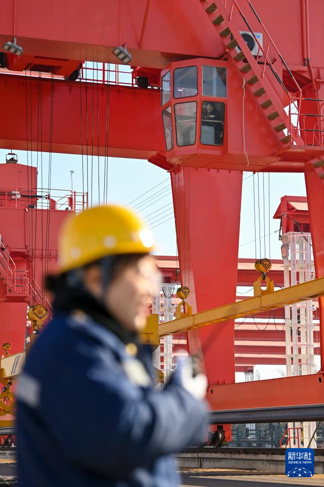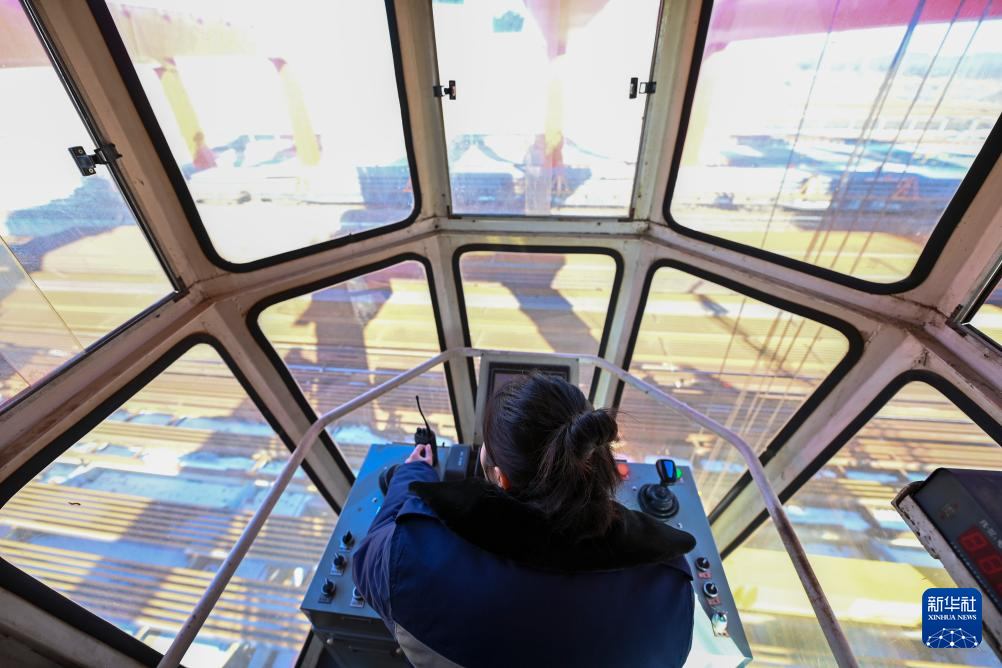 在位于山西大同的湖东钢轨焊接整修基地,代娇娇操作龙门吊运送钢轨(1月24日摄)。 中国铁路太原局集团有限公司太原工务机械段湖东钢轨焊接整修基地位于山西大同,“90后”女孩代娇娇是基地内女子吊装工区的一名龙门吊司机。每次作业,她都需要徒手攀爬十米多高,在仅有两平方米左右的操作室内工作,将一根根钢轨原材料精准吊运到生产线上。 春运即将来临,代娇娇和同事们的工作也变得更加忙碌。代娇娇说:“看着眼前一列列火车经过,想到自己每一次精准吊运都是为了保障列车的安全运行,心里充满了自豪感。” 新华社记者 杨晨光 摄pagebreak
